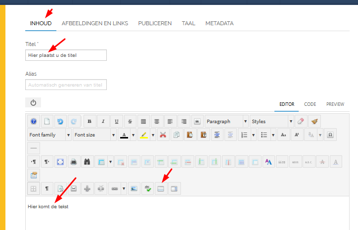 Bij de 1e tab “Inhoud” plaats je de titel van je artikel. Die komt in de blogweergave op de website bovenaan, samen met, eventueel, de aanmaak-datum van je artikel.