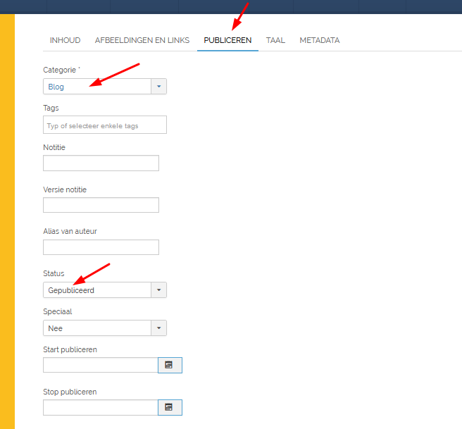 Bij de 3e tap “Publiceren” controleer je steeds bij “Categorie” de juiste categorie van de betreffende blog. De webmaster kan een categorie als standaard instellen, maar als er meerdere blog-categorien zijn, moet de juiste gekozen worden. Dit is belangrijk, want het menu-item van de betreffende blog op de site toont uitsluitend de artikelen die in deze “Categorie” zitten, m.a.w. als de “Categorie” niet of niet op de juiste categorie wordt ingesteld, dan ziet de bezoeker dit artikel niet!