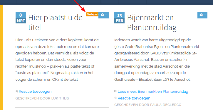 Kijk bij de 3e tap ook steeds of de status op “Gepubliceerd” staat, anders is het artikel (nog) niet zichtbaar voor bezoekers. Zolang je zelf aangemeld bent, is dit wel zichtbaar en dan wordt dit gemerkt met een gele knop “Gedepubliceerd” en kan je het artikel nog steeds verder bewerken en publiceren.
