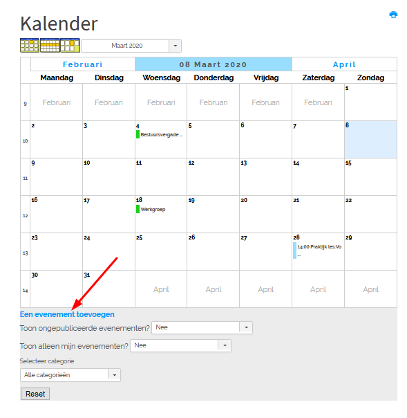 Ga naar de kalender, of als de webmaster een apart menu heeft gedefinieerd, kies je daar voor “Kalender”.