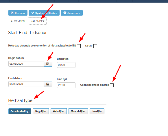 Bij de tweede tab “Kalender” vul je start, einde en tijdsduur in:
