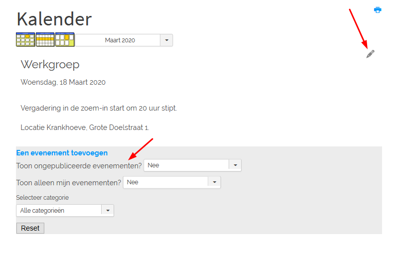 Om een bestaand evenement te wijzigen: klik op het evenement dat moet gewijzigd worden en dan op het bewerk-icoontje (stiftje, rechts bovenaan).