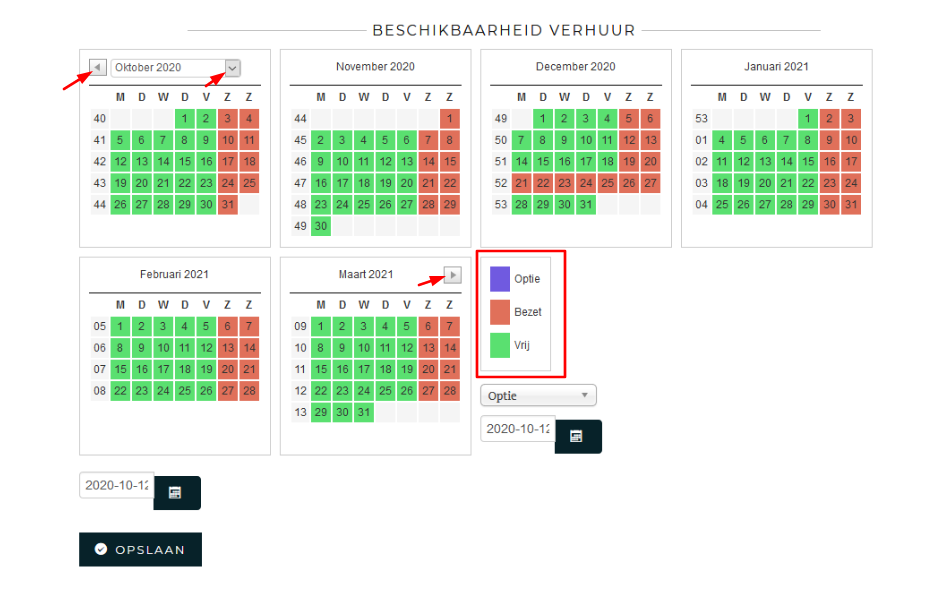 Navigeren door de kalender kan met de navigatietoetsen bovenaan de eerste en de laatste maand. De beheerder van de kalender kan dagen vrij zetten, in optie zetten, of bezet zetten door op de betreffende dag(en) één of meerdere malen te klikken, conform de kleurcode - zie rode kader.