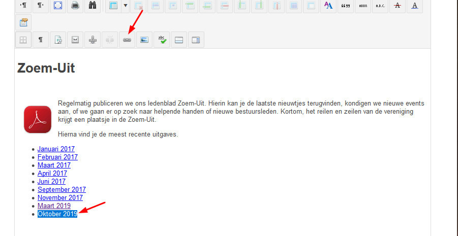 Selecteer deze volledige tekst “Oktober 2019” en klik op het icoontje “Link maken of bewerken”. Je gaat nu een interne hyperlink leggen op de geselecteerde tekst, niet naar een andere pagina maar naar een document dat opgeslagen is in de databank van de website.