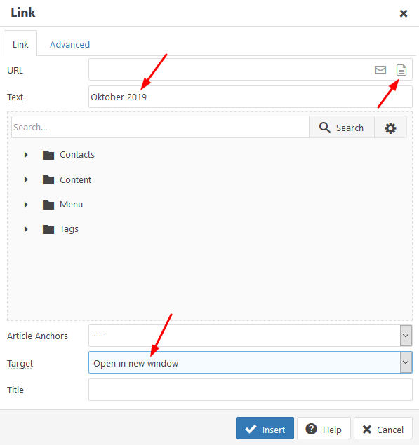 Bij Text wordt al de vooraf geselecteerde tekst ingevuld, bij Target kies je voor “Open In new window”, zodat als de bezoeker hierop klikt, het document in een nieuw venster getoond wordt in de browser.